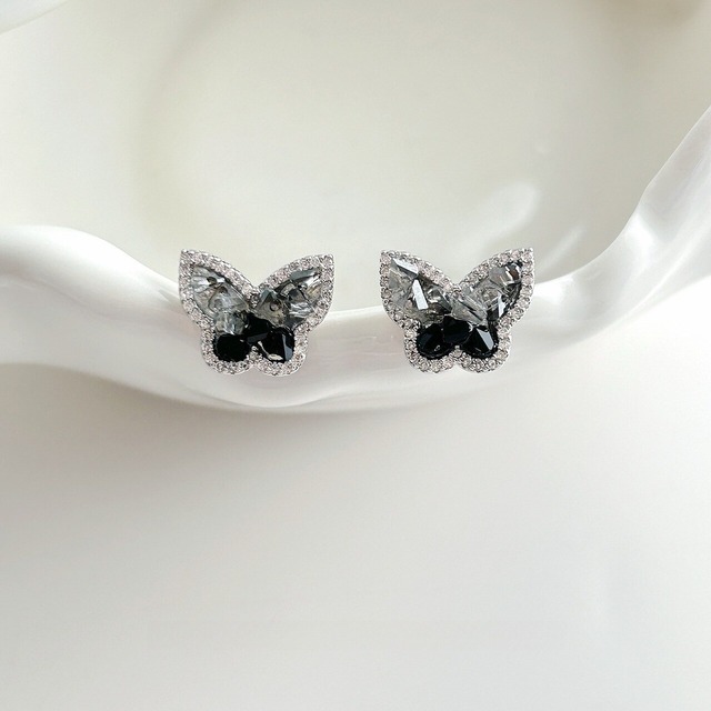 925シルバー クリスタル バタフライ ピアス|ブラック×クリア