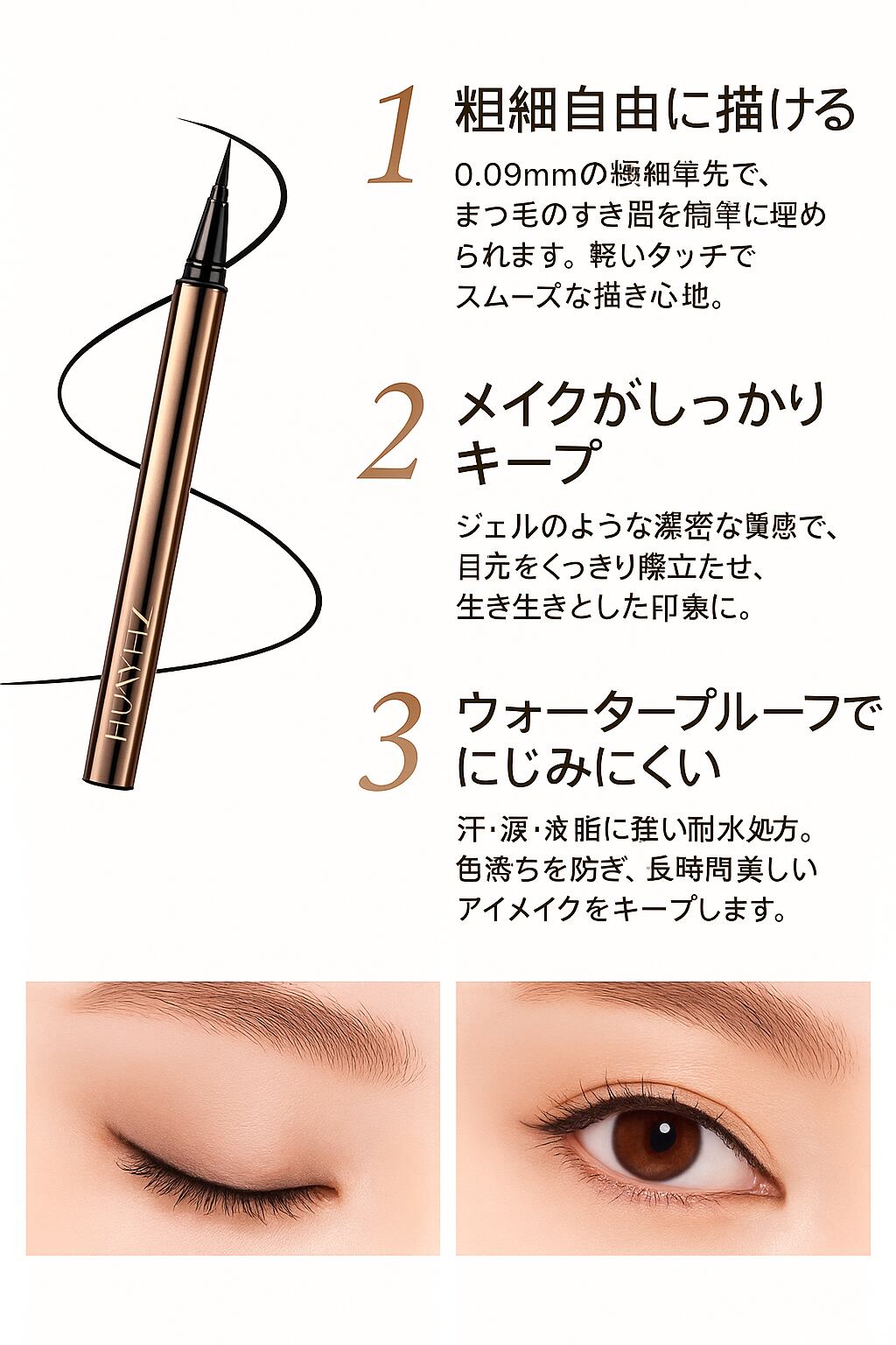 0.09mmの極細筆先で、まつ毛のすき間を簡単に埋められます。軽いタッチでスムーズな描き心地。
