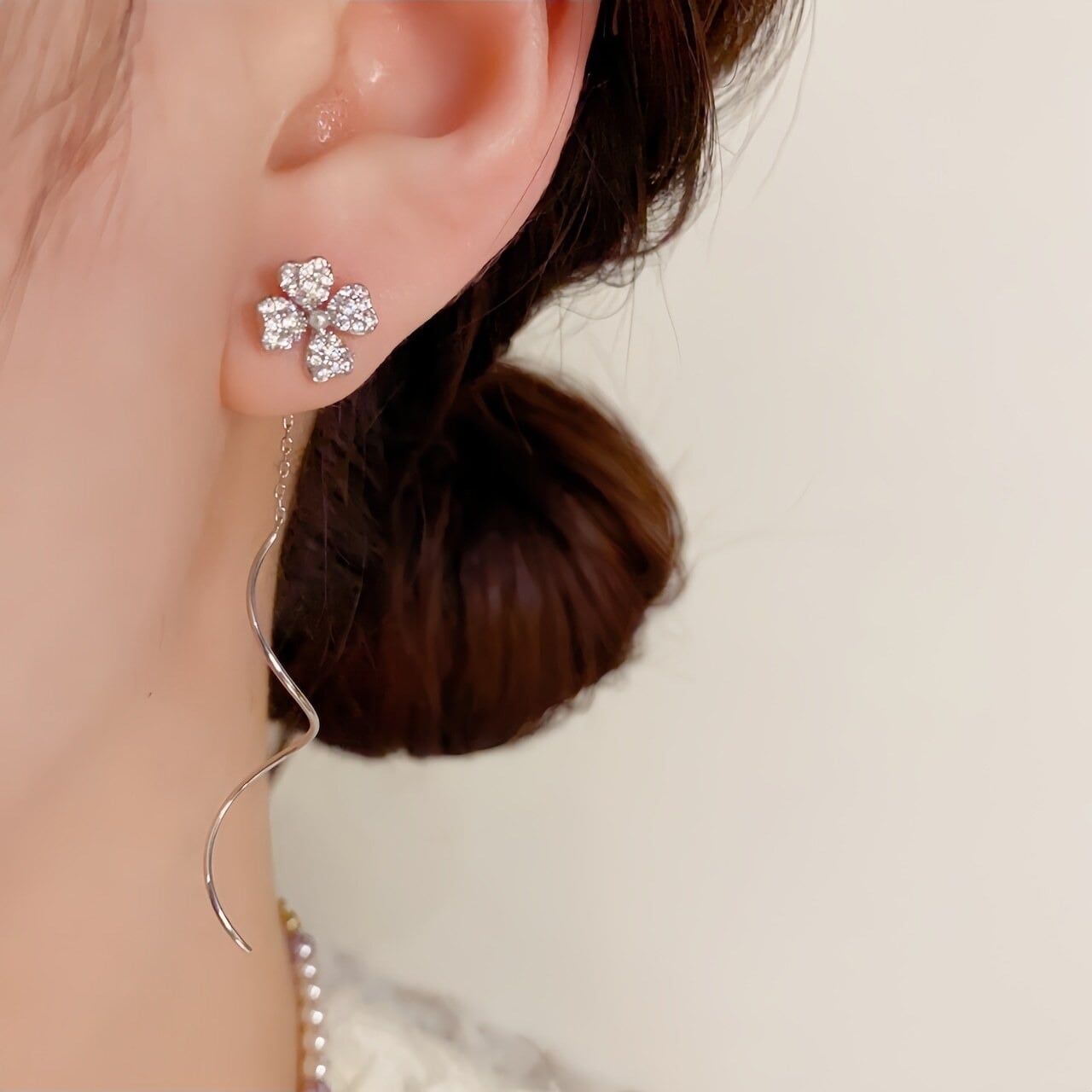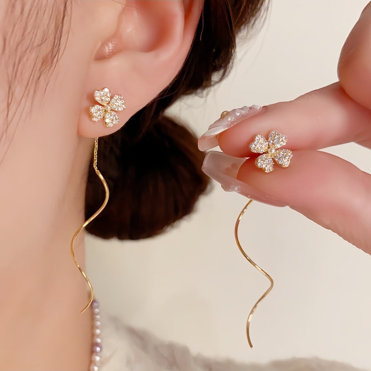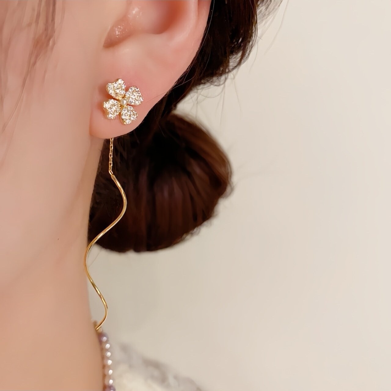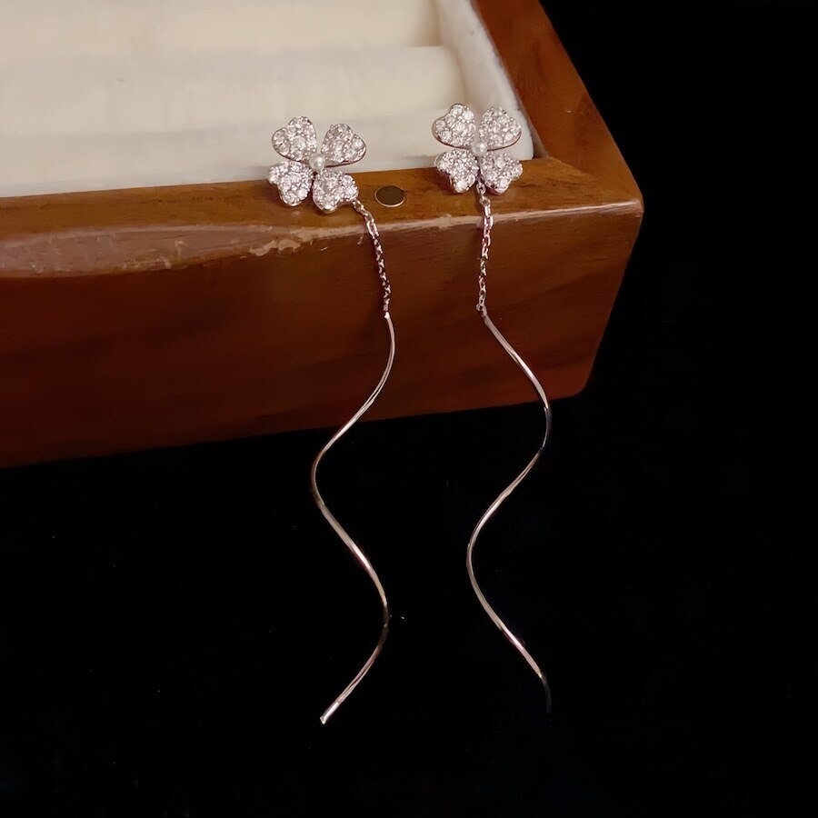 【ピアス】幸運を呼ぶ四つ葉のクローバー×華奢ウェーブ耳線ピアス 上品でフェミニンな揺れ感が魅力