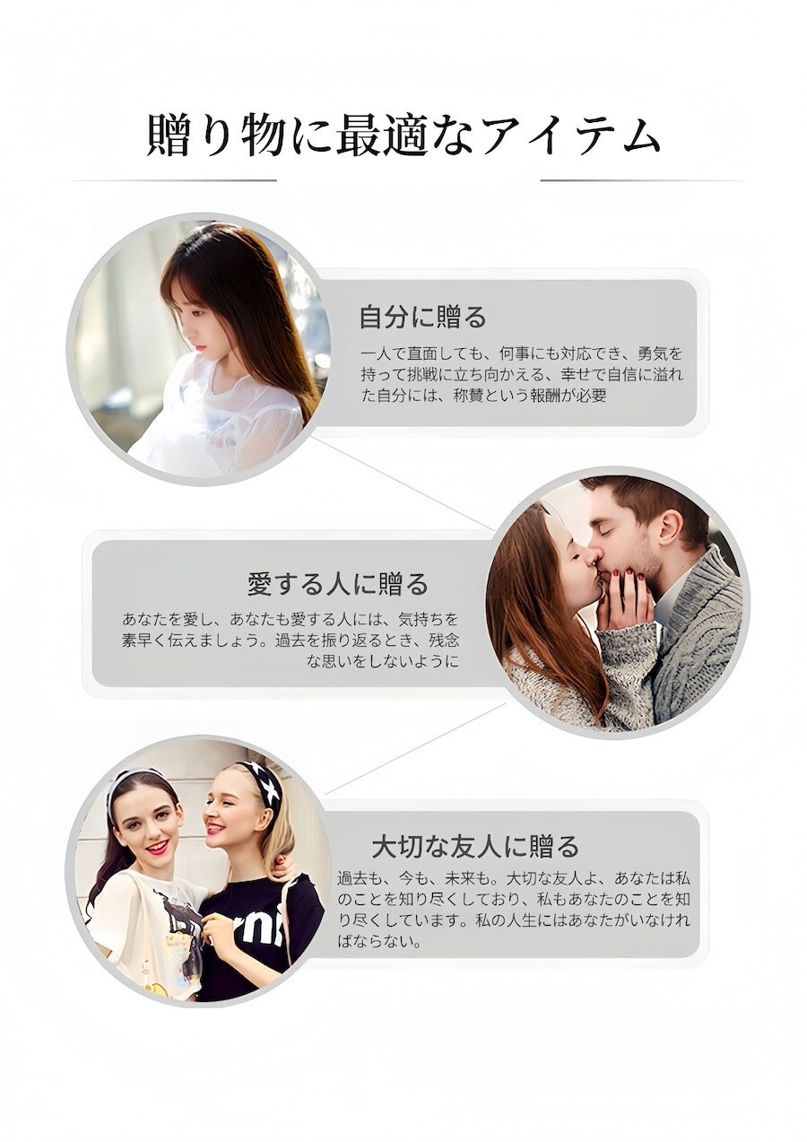 そのエレガントなデザインは、どんなスタイルにもフィットします!軽やかな着け心地を実現し、長時間身に着けても快適さを保ちます。自分へのご褒美や、愛する方への特別な贈り物にも最適な選択肢となるでしょう。
