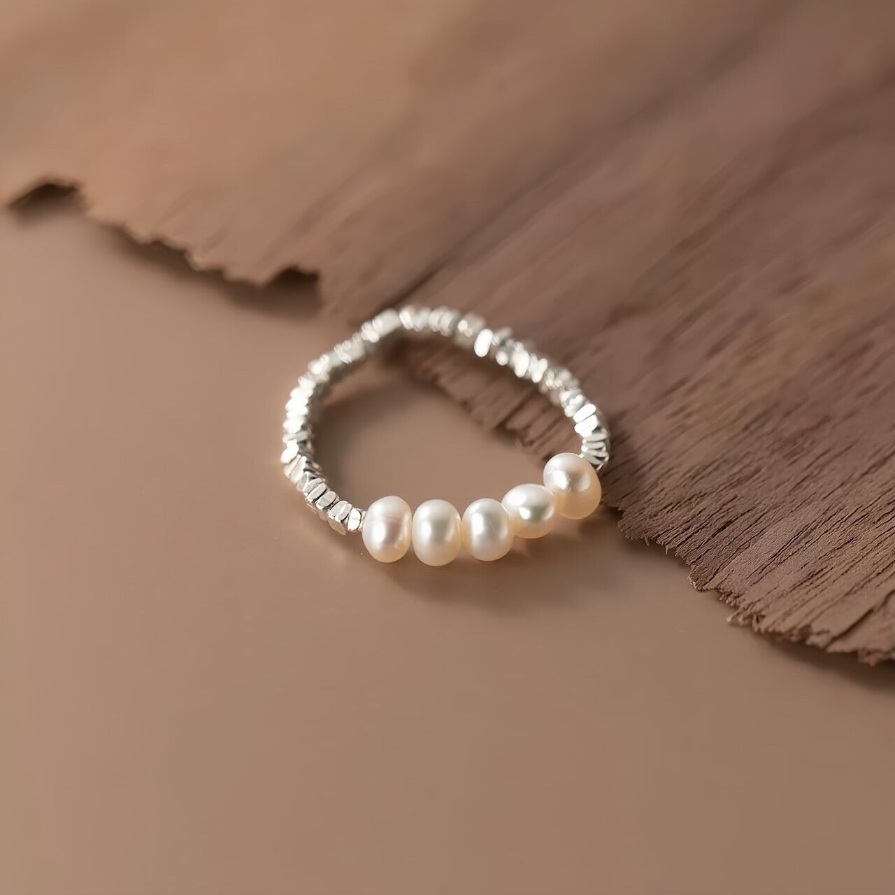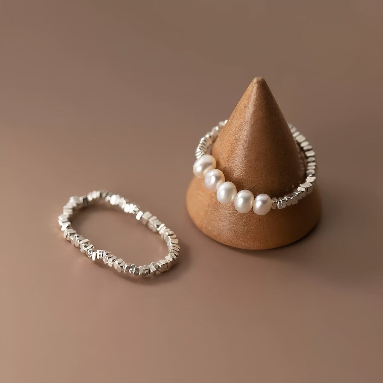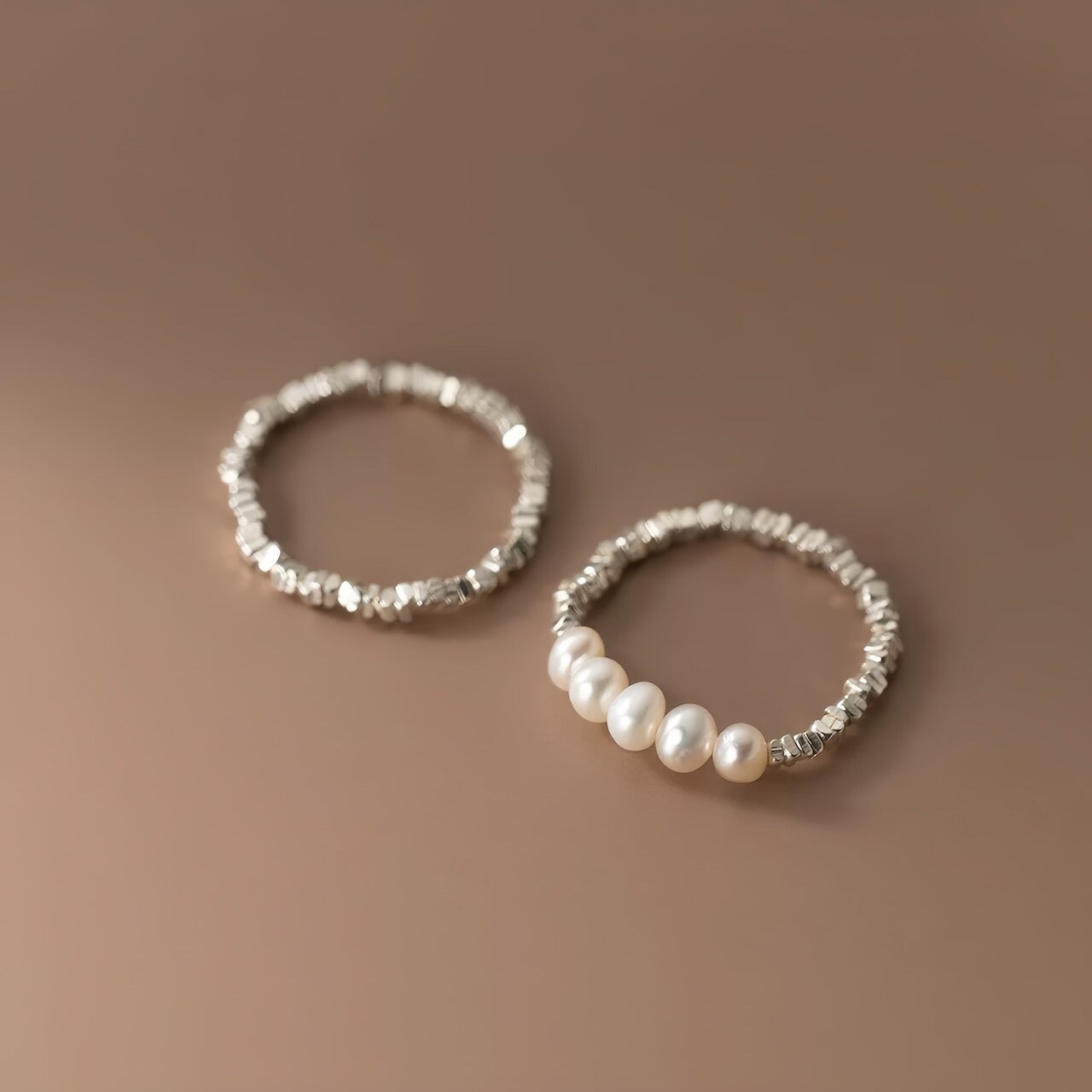 【日本製風】パール×シルバー ビーズリング2点セット|伸縮フリーサイズ・925シルバー素材・上品な輝き