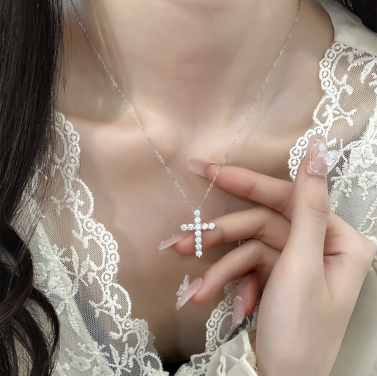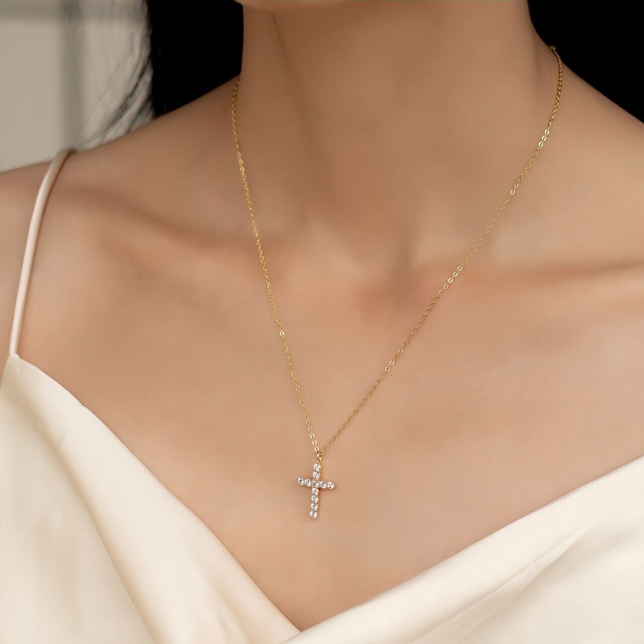 胸元に上品な輝きを添える、ジルコニアがきらめくクロスネックレス。シンプルなのに華やかで、デイリーにも特別な日にもぴったりな一品