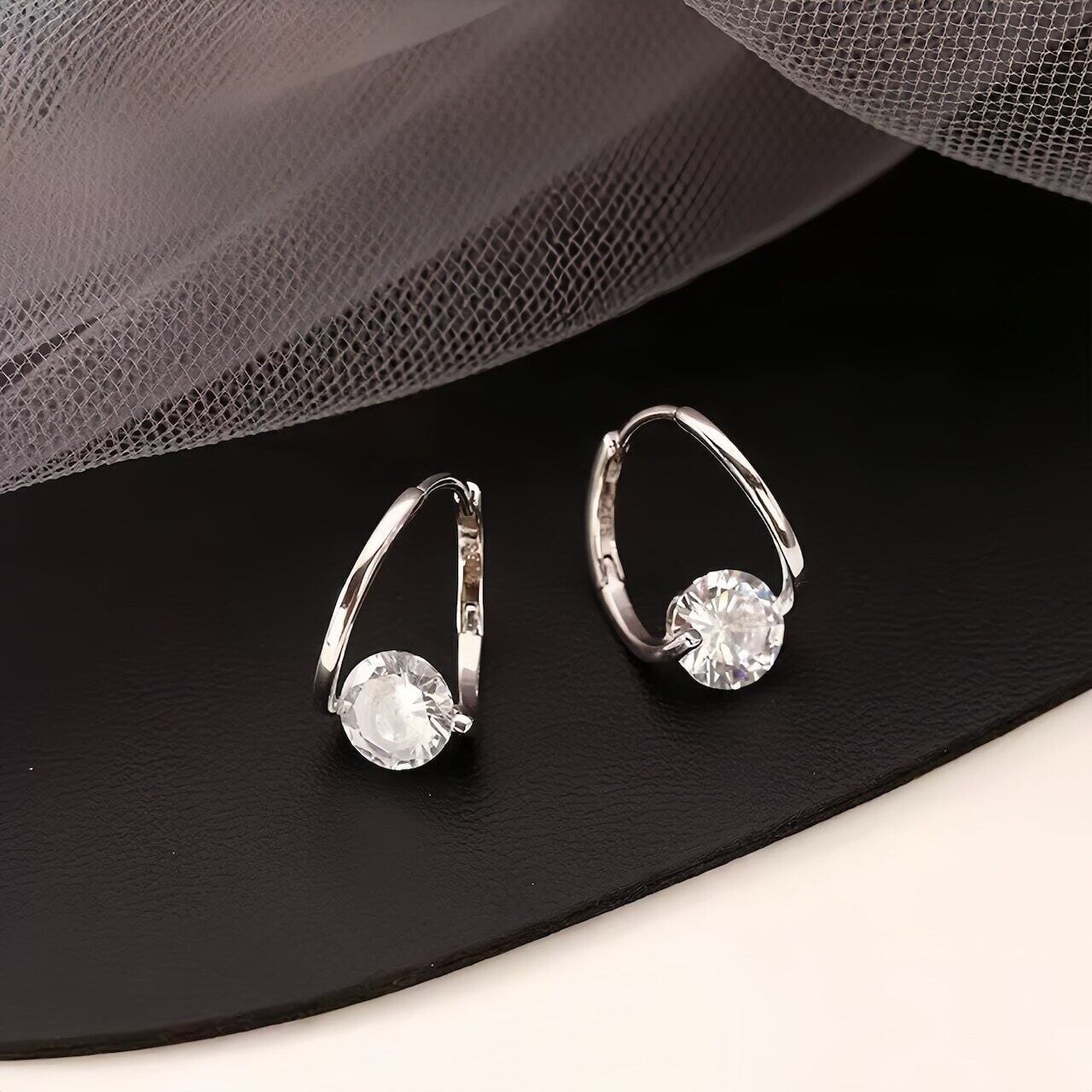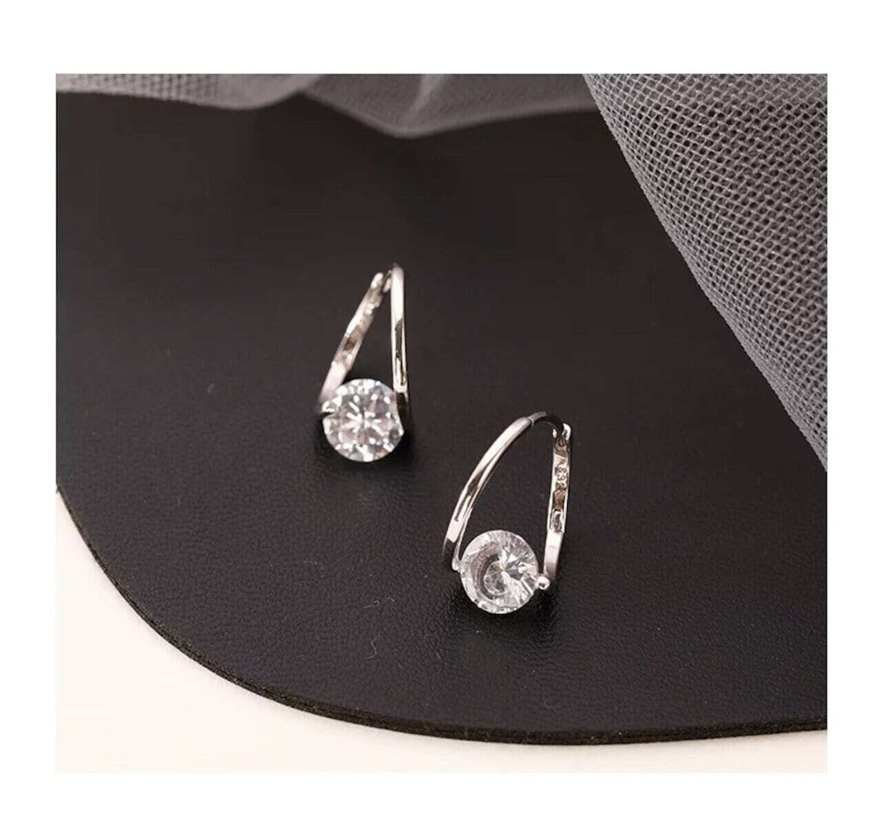 S925純銀ポストを使用した、きらめくクリスタルが揺れるしずく型フープピアス(中折れタイプ)です。
